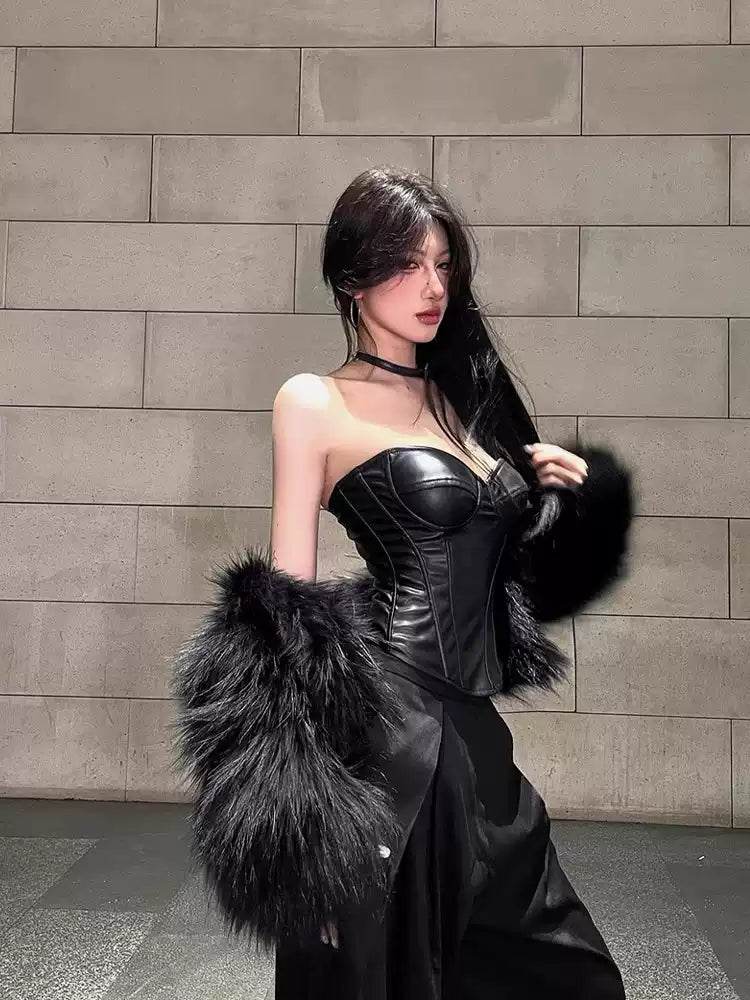 เกาะอกโครงหนัง PU สีดำ ฟิตเข้ารูป สไตล์สาวแซ่บ