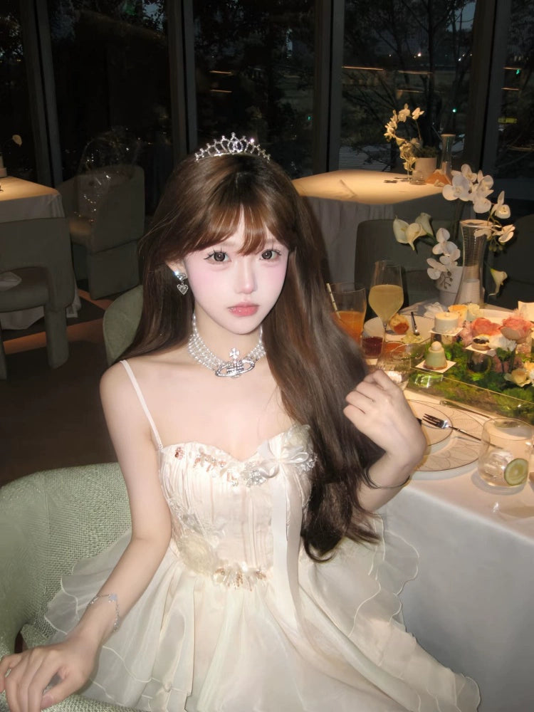 เดรสสายเดี่ยวคอร์เซ็ต ปักมุกลายดอก สไตล์เจ้าหญิง