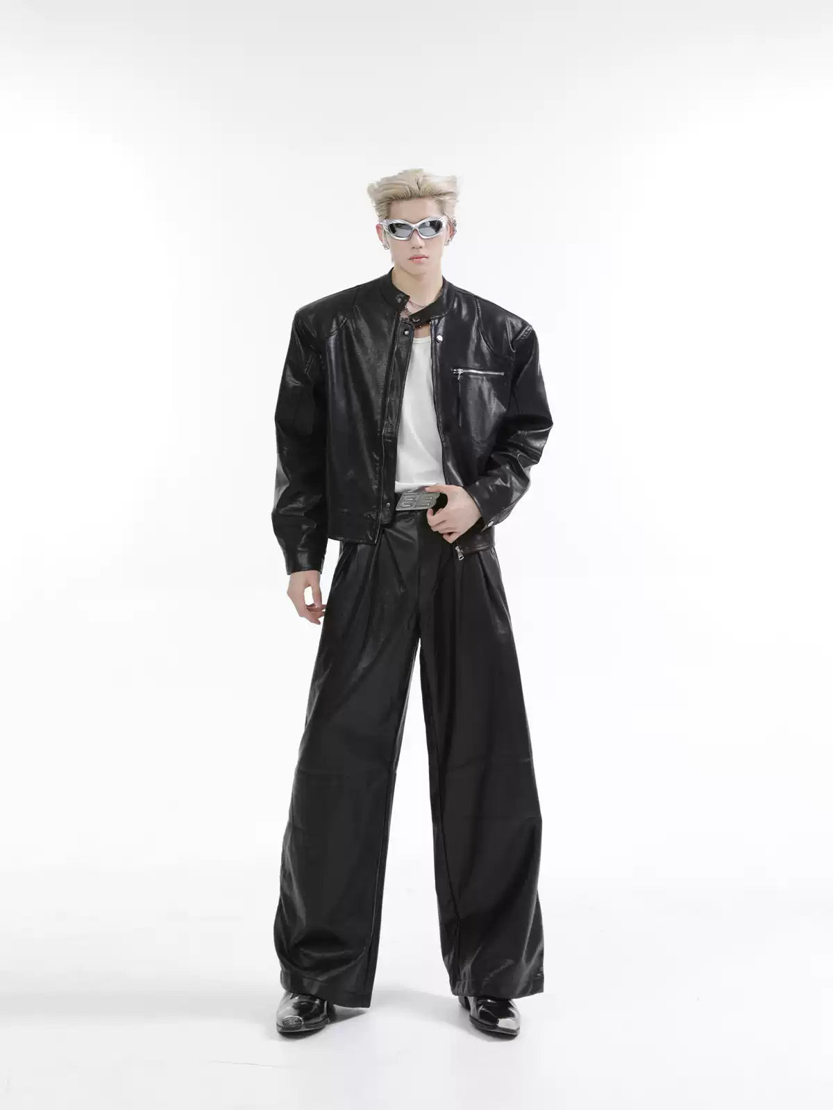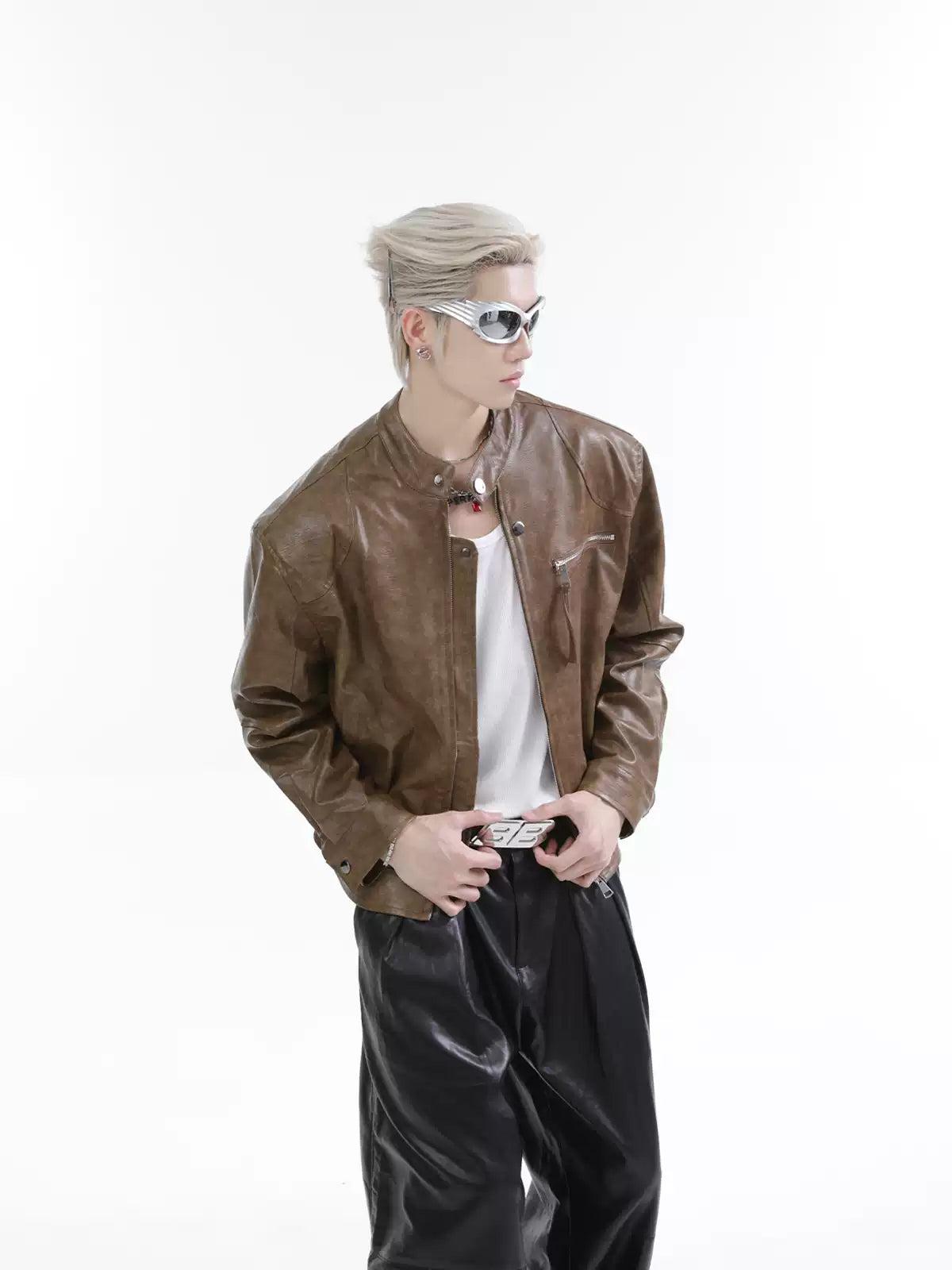 เสื้อแจ็คเก็ตหนัง PU ทรงสั้น ปกตั้ง ดีไซน์ไหล่เสริม สไตล์วินเทจสตรีท